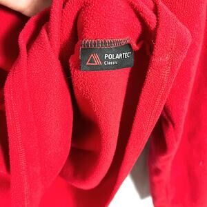 The North Face Polartec Classic 1/4 zip fleece pullover. 100% polyester lightweight fleece in red. Black embroidered logo on front chest. Machine washable
