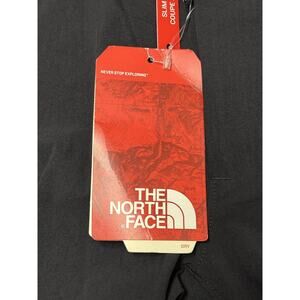 Design/features: Technical hiking pants with stretch performance fabric, breathable/quick-dry comfort, tonal reinforced panels at knees and seat for durability, articulated knee design, low-profile waistband with snap front closure, and zip pocket detail at the front. The North Face logo hit at the left thigh and branded interior label.
