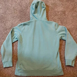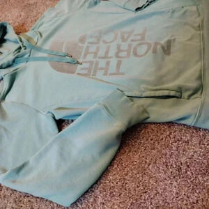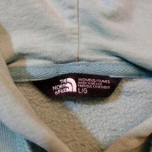 Women's North Face Pullover hoodie, size Large. Light Blue with Metallic Logo. There is a small scuff on the sleeve, and a very small hole, both shown in last two photos. Pre-owned, good condition.