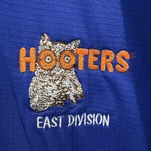Logos/Branding: Embroidered HOOTERS owl with "EAST DIVISION" at left chest; The North Face logo on sleeve and back shoulder