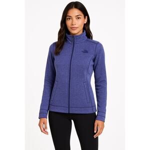 Stay cozy and stylish in this North Face fleece jacket in a heathered purple hue. Designed with a flattering slim fit, full front zip, stand collar, and two front pockets. Perfect for layering in cooler weather, hiking, or everyday casual wear.