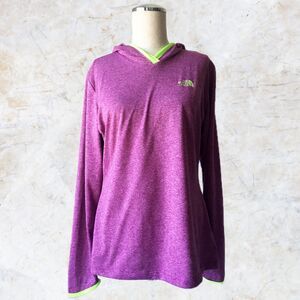 The North Face women's size Medium hoodie. Purple heather polyester pullover top is hooded with neon green lining and trim. Long sleeves with thumb holes. 100% Polyester, Machine Wash.