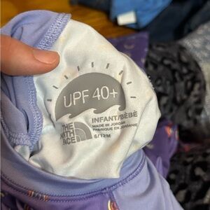 Experience the perfect blend of style and comfort with The North Face bodysuit, featuring a vibrant purple and red color scheme. This form-fitting one piece is crafted from stretchy, athletic material, adorned with a playful pattern of The North Face logos. Ideal for active pursuits, it offers a sleek, rounded neckline and short sleeves for a modern look.