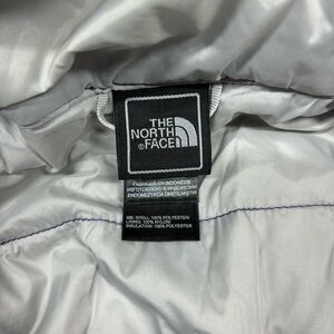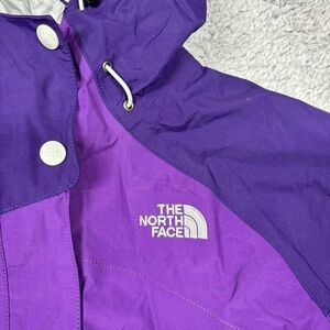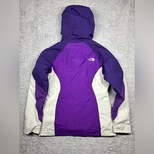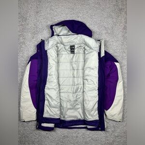Stylish ski jacket with a vibrant purple and white design. Features a hood and durable material for winter sports.