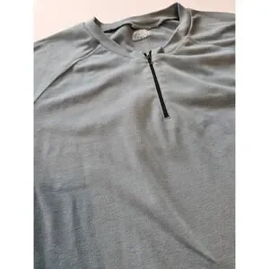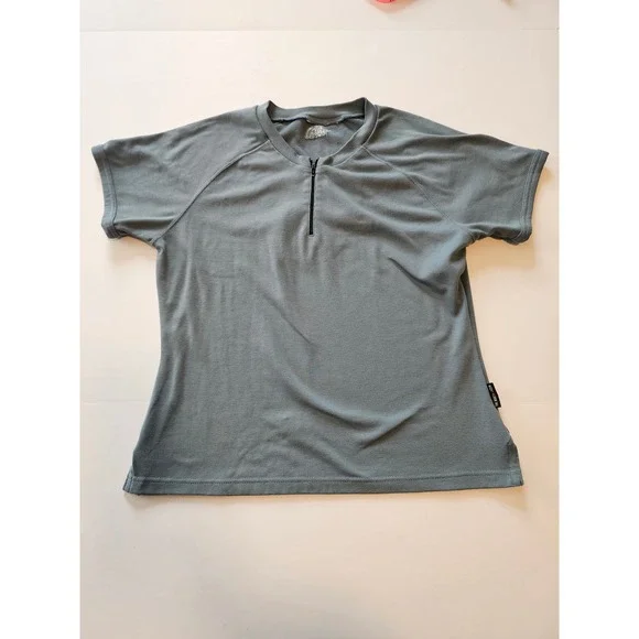 This item is in good pre-owned condition. Some wash wear. The North Face short sleeve top features a versatile quarter-zip neckline and a comfortable raglan sleeve design, making it an ideal choice for hiking, trail running, or casual outdoor activities. The breathable, lightweight fabric is finished in a subtle slate blue-gray hue with an embroidered logo on the back shoulder and a discreet side seam brand tab.