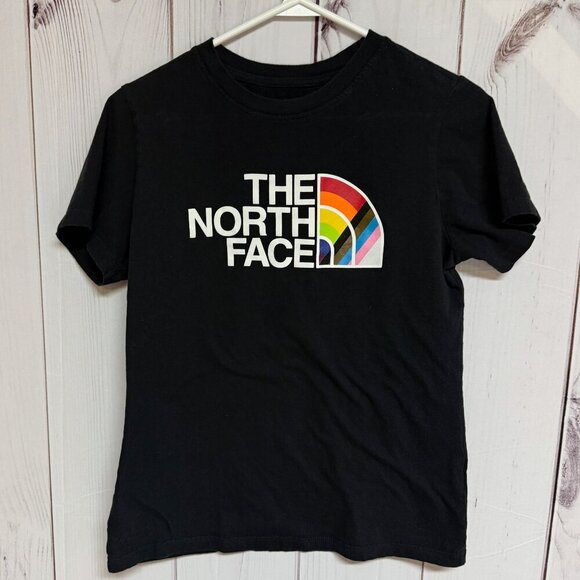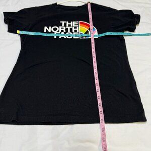 The North Face rainbow logo tee, womens medium black graphic t-shirt, pride style outdoor brand shirt, casual crewneck cotton blend top, trail and streetwear tee, #TheNorthFace #GraphicTee #WomensMedium #BlackTee #EUC