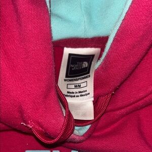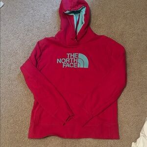 Bold red hoodie with a striking light blue logo. Perfect for casual wear.
