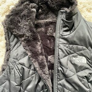Reversible faux fur in one side and down material on the other. Zippered pockets on one side and open pockets on the faux fur side. Excellent condition with no signs of wear.