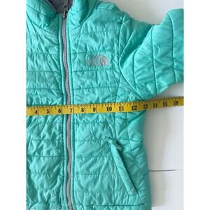 The North Face Reversible Jacket in Girl XS size 6 in Teal Blue is a stylish and functional outerwear piece perfect for outdoor activities in colder weather. Made of polyester with a faux fur lining, this mid-length jacket features a solid pattern, long sleeves, and a zip closure for easy wear. It is designed for versatility, with a reversible feature allowing for different style options. Suitable for travel, activewear, or casual occasions, this puffer jacket also includes pockets for added convenience. With a ski theme and high neck design, this jacket is a practical and fashionable choice for young girls.