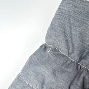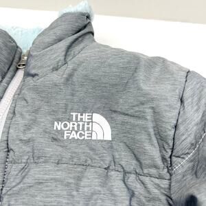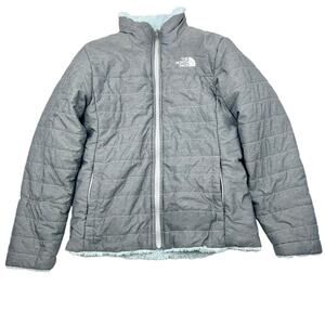 The North Face Reversible Mossbud Jacket. Gray on one side and blue on the other. The gray side is VGUC, has a s pulled stitch. The blue side is play, multiple marks/discolorations that might come out if treated. Size M or 10-12.