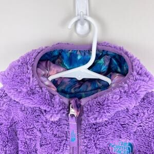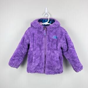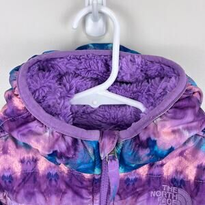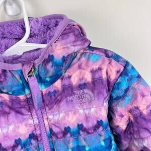 The North Face Reversible Mossbud Swirl Insulated Jacket. Toddler girl size 3T. Fun mixed blue, pink, green, and purple printed quilted water-repellent taffeta on one side and super-soft purple Silken fleece on other. Great condition with light wear to cuffs.