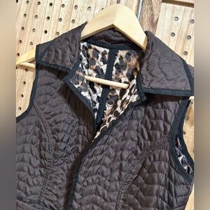 The North Face women’s reversible quilted vest in brown and leopard print with roomy pockets and cozy layering warmth.