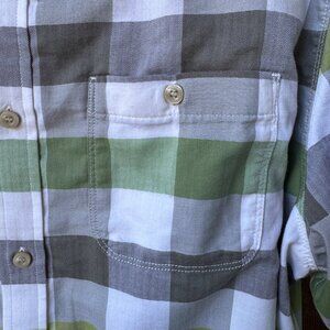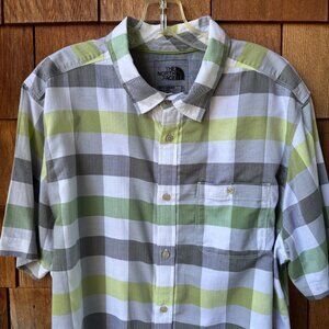In Excellent, Lightly Worn Condition! The North Face Send Train shirt for men, characterized by its plaid pattern featuring white, green, and gray colors. It is a short-sleeved button-up shirt with a chest pocket. Easily goes from office to trail and everything in-between.