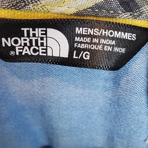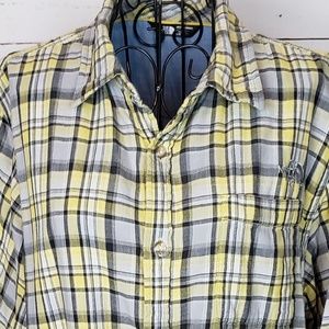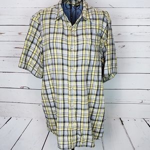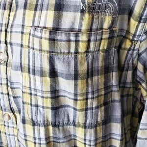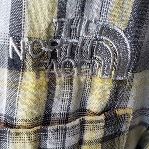 The North Face Shirt. Yellow, Gray and White Plaid. Short Sleeve Button Down. One Front Pocket. Gray Stitched Logo above Pocket. Shirttail Hem. 100% Cotton. Great Preowned Condition. Size Large. Flat Lay Measurements: Chest 23" Length 29".
