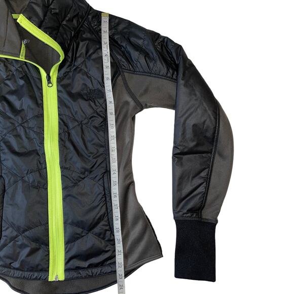 This North Face jacket features grey and black colors with neon yellow accents, zip front closure, thumb holes at wrist, two front zip close pockets, and thinsulate material to help keep you warm. Measurements in photos are for estimates only. This jacket is in excellent pre-loved condition.