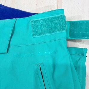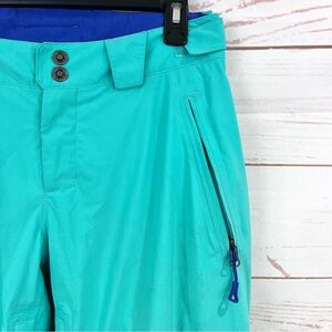Waterproof, breathable, fully seam sealed. Adjustable Velcro waist tabs. Belt loops with clip integration. Kissing welt water-resistant zip hand pockets. Water-resistant zip cargo pocket with phone pocket and bellow. Flap-cover, water-resistant zip inner-thigh vents with mesh gussets. Reinforced cuffs with cuff-zip gussets. Stretch gaiter with gripper elastic and boot hooks. The color is a light mint teal green color. These are more of a green in my opinion. Light wear near the bottom hem and some faint spots but overall in great condition.