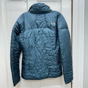 The North Face Summit Series pertex quantum packable puffer jacket coat women's medium hidden cinchable hem from inside pockets pit to pit 21 can pack into the front right pocket. logo wearing off on back as shown as well as inner 'tag' is wearing off. light mark as shown. one ‘spot’ as shown (hard to photograph but is shown in last photo) and one thread is loose as shown in last photo.