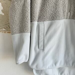 The North Face sherpa fleece pullover in two-tone gray and ivory. Thick, plush pile on top meets smooth fleece below, with a quarter zip and stand collar for warmth and comfort. Soft, warm, and classic North face quality, she's your grab-and-go layer for cold days.