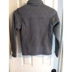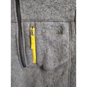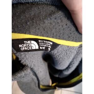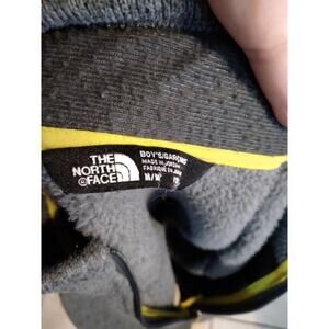 This is a gray The North Face sweater for youth boys in size Large. It features a 1/4 zip closure, long sleeves, and a pullover style. Made of polyester, this jacket is suitable for casual occasions and is machine washable. The jacket is designed for outdoor activities like walking, fishing, hiking, and running, making it a versatile piece for winter, fall, and spring seasons. It includes accent details like a zipper and is insulated with polyester for added warmth.