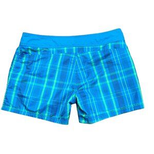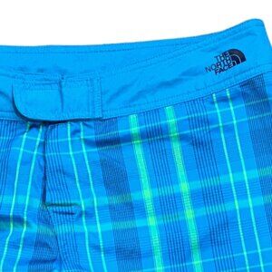 The North Face Swim Board Shorts Reversible Size 12 Outdoors Summer Beach Pool. These trunks are made of 100% Polyester. They measure Waist (lying flat) 17.5", Rise 9", Inseam 4". These shorts are reversible. One side is teal, the other side plaid. These shorts are in great, used condition. Ships from a Smoke Free Home. Any questions, please ask. All reasonable offers welcome.
