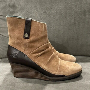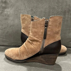 Stylish tan ankle boots. Comfortable and durable. Perfect for any occasion. Bought and not worn because of the hill I walk multiple times a day at work. Beautiful wedges, insulated!