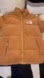 Warm tan jacket with high neck. Features The North Face logo and 700 fill power only worn once. It actually bought it for myself I wear a medium size coat in women and it fits perfectly, I just found another coat that I like better.
