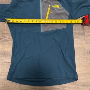 Teal pullover by The North Face. Features yellow zipper and logo. Gray chest pocket adds contrast.