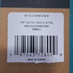 This is a The North Face Tech 1/4 zip women's small Fleece in Maui Blue Heather. It's new with tags with no flaws. Stylish and comfortable, it's perfect for spring and fall or for layering in the winter.
