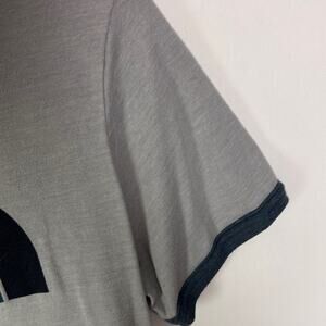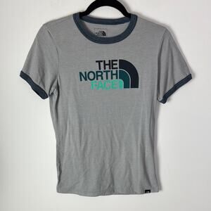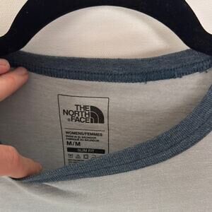 Gently Used The North Face Slim Fit Tee Shirt. This is a women's medium. Mostly gray with navy blue accents on the collar and sleeves. Multicolor The North Face logo on the chest. 50% polyester, 37% cotton, 13% viscose.