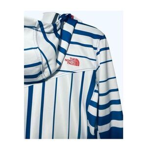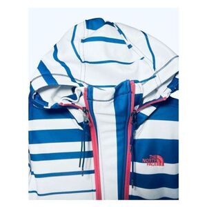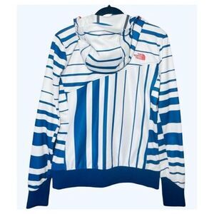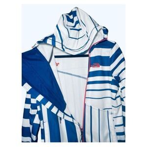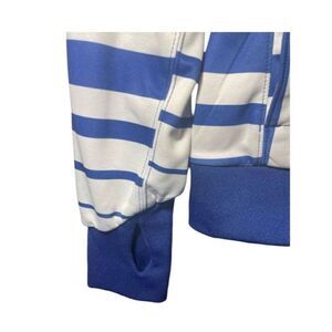 Fleece lined, soft material, thumb holes, 2 side slip pockets, ribbed cuffs and hem, EUC, zip closure and signature logo