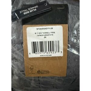 The North Face Thermoball Eco Parka in size 3XL is a stylish and functional winter coat designed for women. Made with polyester outer shell material and polyester lining, this hooded parka features embroidered logo accents, zipped pockets, water repellent properties, and insulation to keep you warm in colder weather. Perfect for travel, casual wear, or work, this long-sleeve jacket in a solid gray color is a practical and durable choice for the winter and fall seasons. Easy to care for with machine washable instructions, this plus-size parka from The North Face is a must-have for the modern woman.
