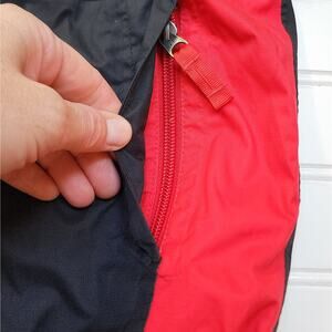 The North Face Toddler Dryvent Rain Jacket, size 4T, black, gray and red, zippered hand pockets, adjustable cuffs, waterproof, bit heavier than the super light windbreaker jackets, logo on left chest has some slight cracking...see pic, otherwise in very good condition.