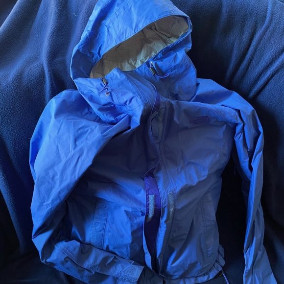 The North Face Venture Rain Jacket in Periwinkle, size M. Good used condition. There are some signs of wear on the inside of the jacket, but the outside is in perfect condition and entirely rain-proof.
