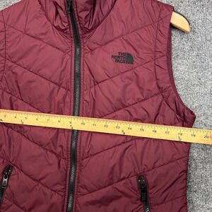 Stylish sleeveless puffer jacket by The North Face, perfect for adding a layer of warmth and style to your outfit. This burgundy vest features a full zip closure, providing adjustability and convenience. With its quilted design and sleek silhouette, this jacket offers a flattering fit and a contemporary look. Also featured are zippered hand pockets, adding functional storage space for your essential items.