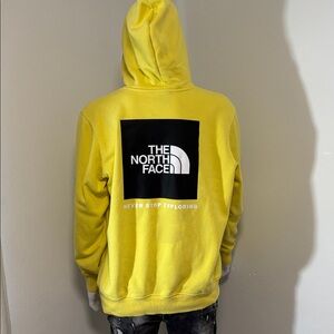 Vibrant yellow hoodie by The North Face. Includes front pocket and adjustable drawstring hood. Fair, used condition. Has some staining on the front, as pictured.