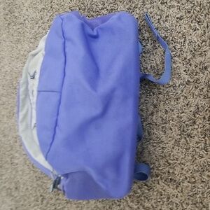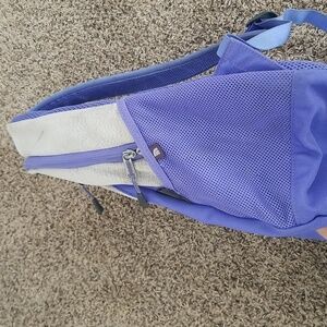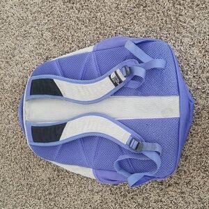 The North Face Wasatch medium sized back pack in purple and gray. multiple logis placed throughout. Multi pocket storage components, perfect for school or for a fun hike.