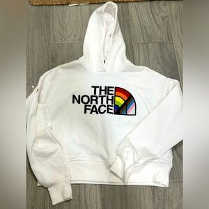 Stylish white hoodie featuring a vibrant rainbow logo from The North Face. Perfect for casual wear.