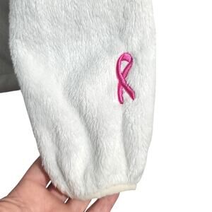 Description: The North Face White Osito Jacket, size XS, used with good condition. Features 100% polyester, standard fit, soft high-pile Silken raschel fleece, stand collar, secure-zip hand pockets, full-length center front zip with internal draft flap, elastic binding on cuffs, breast cancer awareness ribbon on sleeve, blue mark on cuff, perfect for cold-weather wear. Smoke-free home, fast shipping, bundle to save!