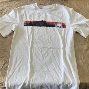 White tee featuring a bold red and black graphic. Iconic The North Face style. Great condition