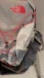 Durable white backpack with pink accents by The North Face. Ideal for hiking and travel.