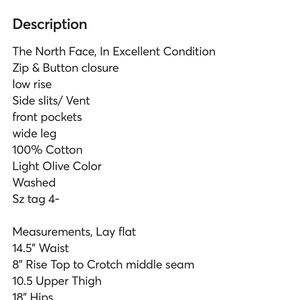 Stylish wide-leg cropped pants in a light gray color. Features front and back pockets. North Face. Size 4. Excellent used condition.