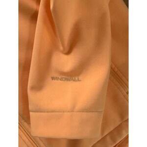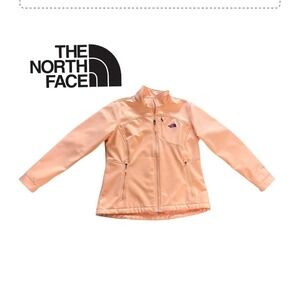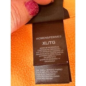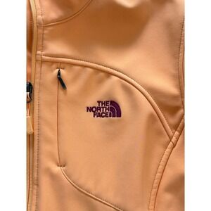 This fabulous jacket from The North Face is a tangerine color with purple North Face on the front and back. Zippered front and pockets. Inside has a fleece like feel. Excellent smoke free condition.
