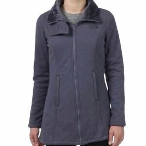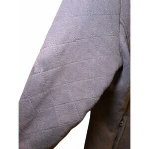 Stay warm and stylish with this beautiful The North Face Caroluna quilted fleece jacket in a lovely muted purple color. This jacket features a comfortable and fuzzy lining, perfect for those chilly days. Color is a soft purple with almost a grey undertone. Nice tall three button collar. Full front zipper with front zipper pockets. Small elastic band at the back waist. Fitted style. Long in length.