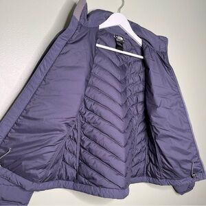 The North Face women’s 550 down flare jacket in a dark purple/blue color. Size XS.