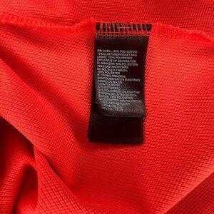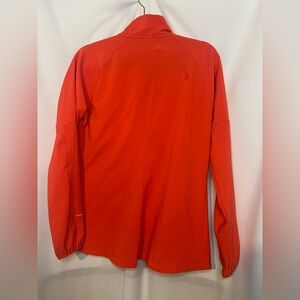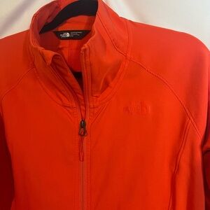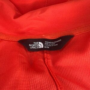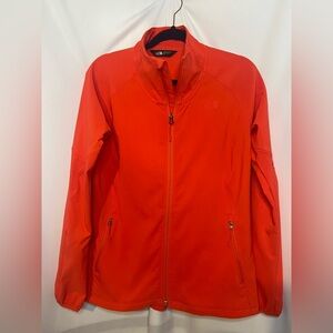 Bright orange jacket by The North Face. Features a full zip and side pockets. Perfect for outdoor activities.