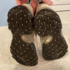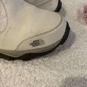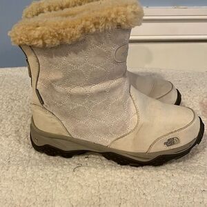 Keywords: The North Face, women's snow boots, beige boots, suede boots, waterproof boots, insulated boots, mid-calf boots, winter boots, faux fur lining, side zip boots, flat heel boots, winter footwear, pre-owned boots, casual winter boots, winter commutes.