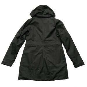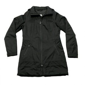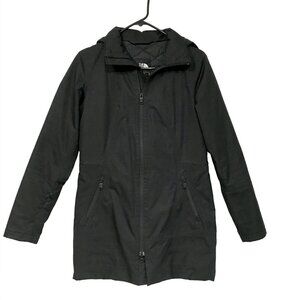 The North Face Women's Black Insulated Ancha Parka Hooded size small. Removeable hood, inside zip pocket and zip pocket in sleeve. Approximate measurements: Underarm to underarm 18", length shoulder to hem 29". Pre-owned in good condition.