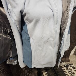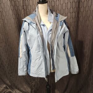 Stylish and functional ski jacket. Features a blue and gray color scheme. Ideal for winter sports. Includes matching fleece inner jacket.