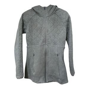 The North Face Women's Caroluna Hooded Fleece Jacket in Olive Green, Size XS, is a stylish and functional outerwear piece perfect for travel and casual occasions. Made from 80% cotton and 20% polyester peached fleece, this mid-length jacket features a quilted design, embroidered logo accents, and a full zip closure with zipped pockets for convenience. The hooded jacket is insulated with polyester and lined with 100% polyester raschel fleece, making it ideal for winter, fall, and spring seasons. With its slim fit and heathered pattern, this jacket from The North Face is a great addition to any outdoor-themed wardrobe.