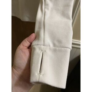 This is a stylish and versatile white funnel neck sweater by The North Face for women in size S. The sweater features a solid pattern with slit sleeves and a slim fit, perfect for various occasions such as travel, parties, casual wear, and work. Made of a blend of polyester and cotton, this sweater is machine washable and suitable for summer, fall, and spring seasons. With a designer theme and logo accents, this sweater is a practical and fashionable choice for outdoor adventures or city outings.
